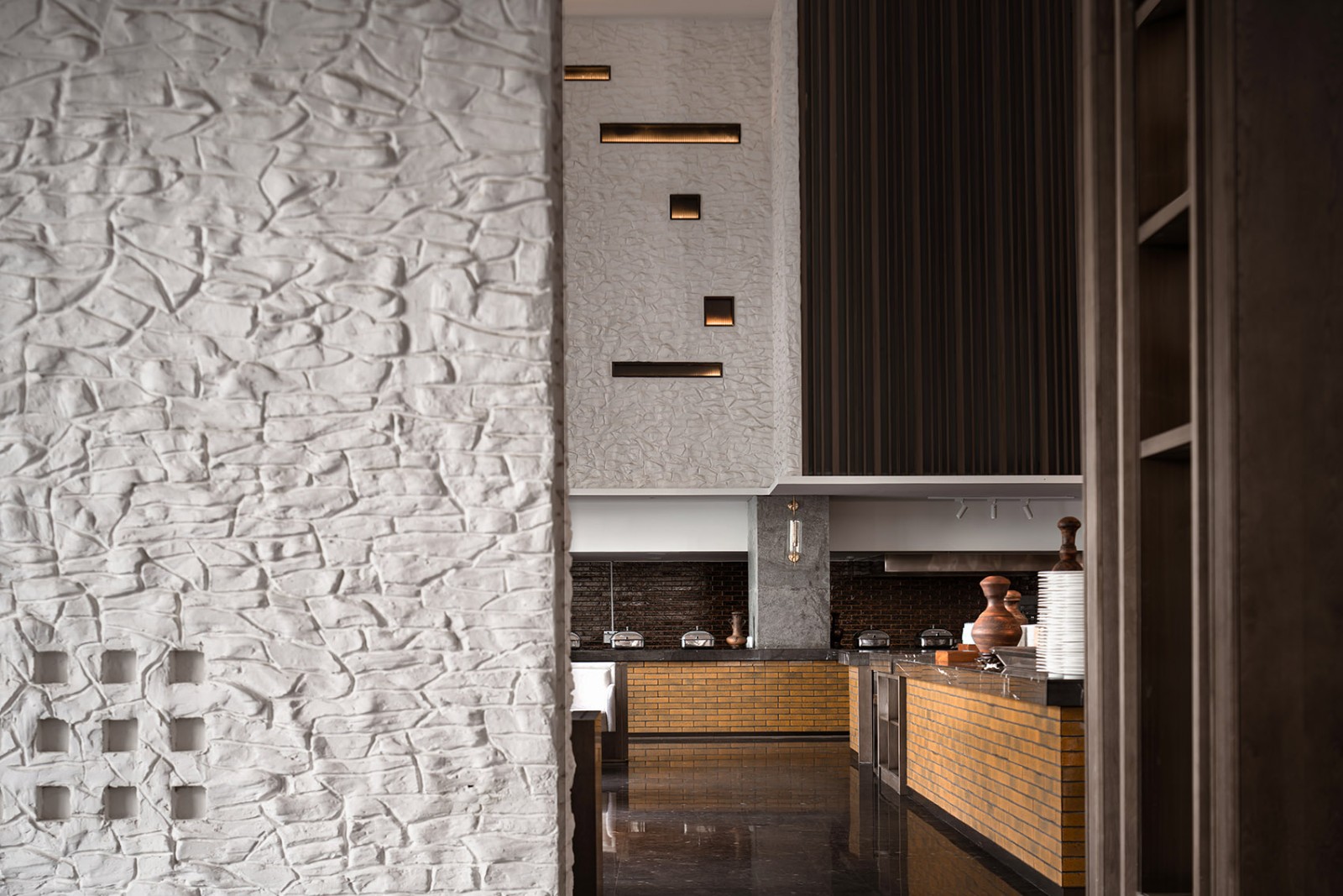 藏式陈设柜,精雕细琢的门拉手。天然质感薄石材墙营造空间序列感。天然质感薄石材墙、藏式边玛墙融合艺术画廊。GYD 以当代美学视角审视地域文化,将“当代性”、“藏式文化”、“艺术性”共融、共生,打造极具民族特色的藏羌博物馆。艺术大堂入口处摆放着建造酒店地基时挖出来的漂砾石。大堂休息区布置在景色最好的区域,这里被自然森林所环抱,不同的时节可感受不同的风景。
